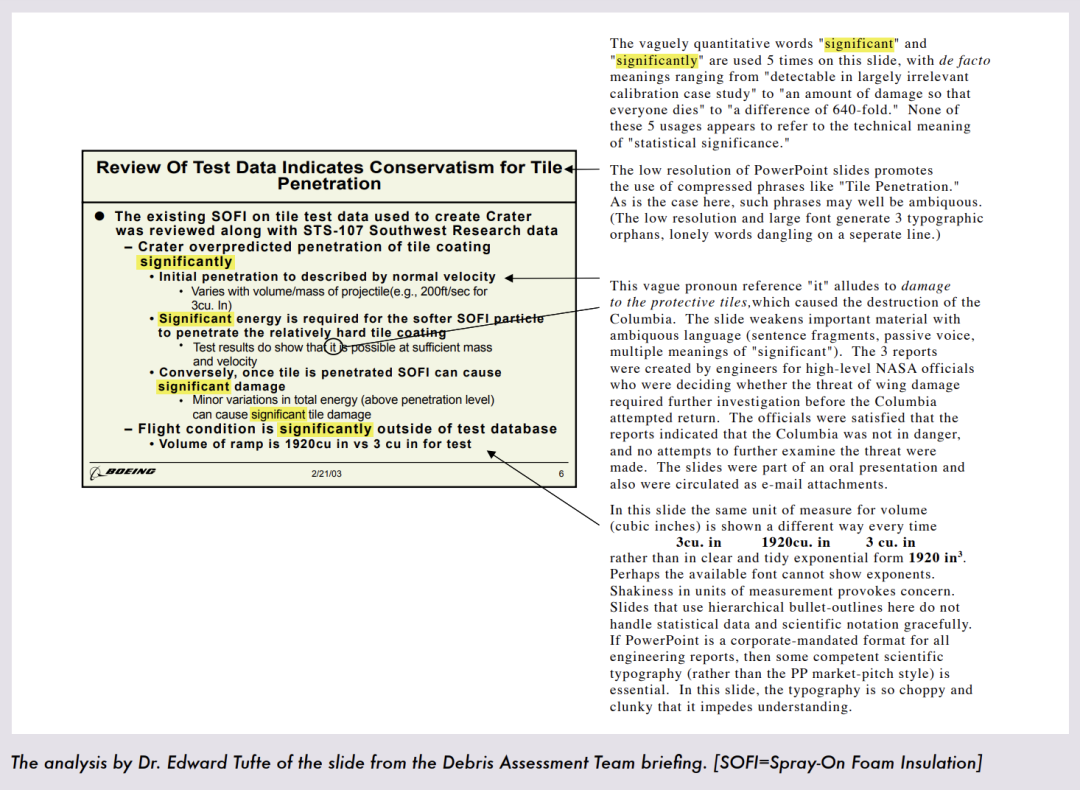 在这之后,耶鲁大学的统计学家爱德华·塔夫特在分析事故的原因时指出,其实早在1月NASA 高级管理人员就获得了一张PPT,上面写明了绝热材料碎片脱落造成的损坏。然而,由于PPT排版太烂,这条危险的信息隐藏在一大块文本框里,没有引起工作人员的注意。