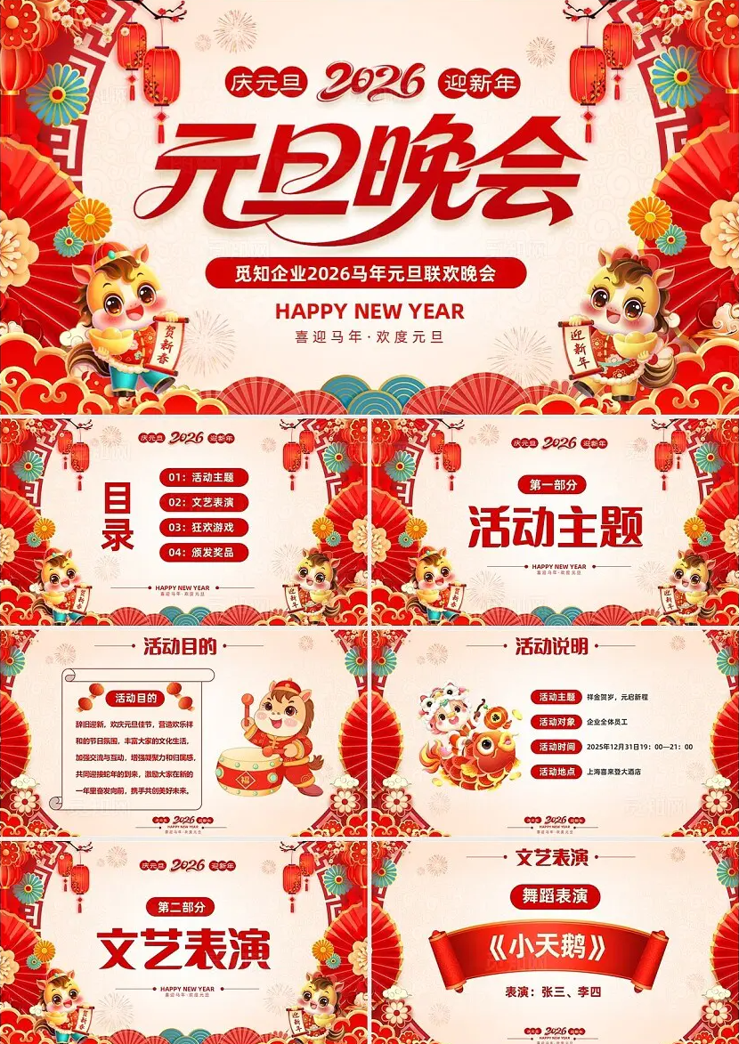元旦将至,为助您轻松筹备各类庆祝活动,我们精心搜集整理了100余套元旦晚会PPT模板和发言稿,涵盖学校联欢晚会、班级主题班会、元旦游园会及公司联欢会等多元场景,风格多样,创意满满。无论您是策划大型庆典还是小型聚会,都能在这里找到心仪之选。数量有限,速来领取,让您的元旦活动因这份专属资料而更加精彩纷呈,不容错过!