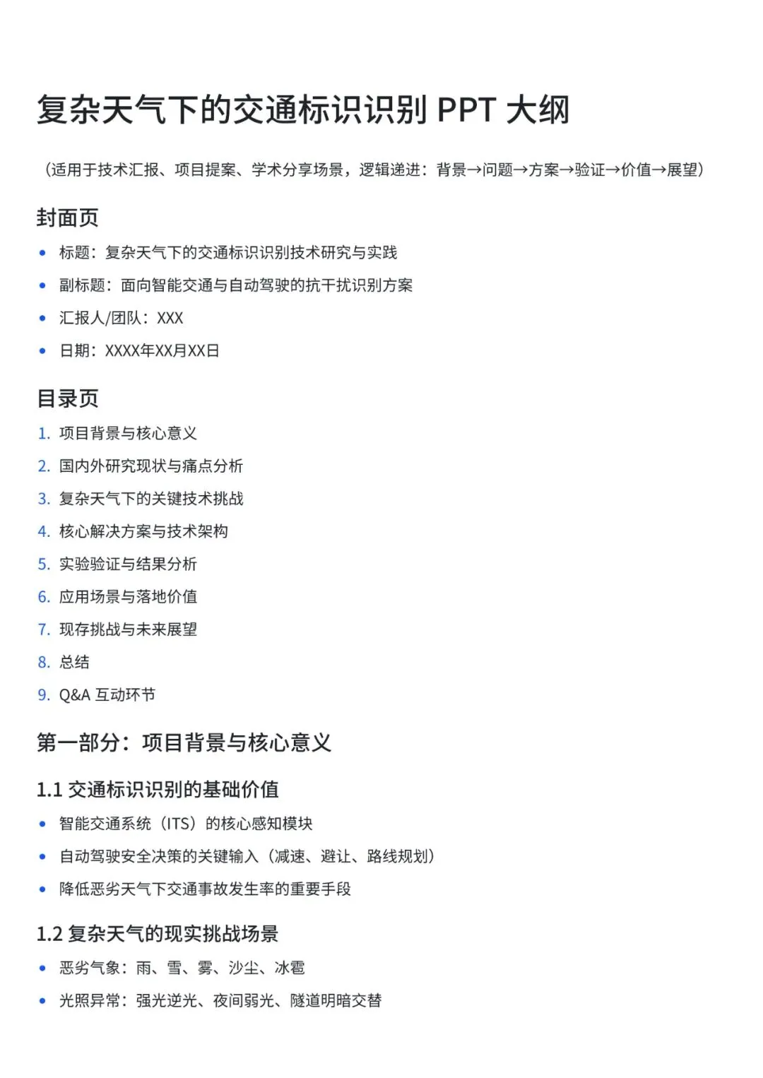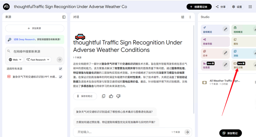 生成一个关于“复杂天气下的交通标识识别”的技术报告PPT。第二步:打开notebooklm,导入大纲,点击生成“演示文稿”