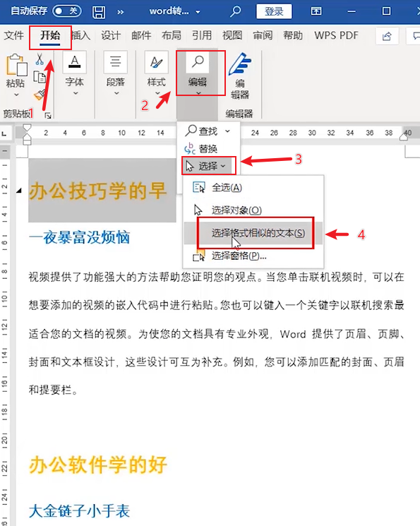 每当你做好的 Word 文档,都要一点一点的复制到 PPT 中,不仅浪费时间,还容易复制串行?不如用 PPT 直接编辑文档来的省事~不是说三剑客配合无敌么?怎么到你手里就成了更麻烦的事情呢?是咱们自己不知道怎么操作呢?还是微软的设计有问题。不!不!不!小胖包告诉你,其实 Word 是可以转成 PPT 的!方法如下:视频都看完了么?不方便看视频的,可以看我们的图文教程哦!早点学会早下班鸭!❶ 首先,我们打开编辑好的文档,选中我们的一级标题。❷ 开始选项卡中,点击【编辑】,【选择】,【选择格式相似文本】。❸ 然后打开【开始选项卡】中的【段落】,把【大纲级别】设置为 1 级,点击确定。❹ 重复第二步的方法,我们选中副标题,将副标题的大纲级别改为【2 级】,同样的方法选中正文,将正文的大纲级别改为【三级】。❺ 保存后关闭 Word 文档,最后将 Word 文档的后缀【docx】改为【PPT】。我们再打开这个文件,就是按照你的分级,每 1 级、2 级、3 级为一页啦。最后偷偷的说一下,Excel 的图表也可以和 PPT 互相配合哦~小包吐血推荐秋叶家的经典好书《和秋叶一起学 Word》、《和秋叶一起学 PPT》、《和秋叶一起学 Excel》!用 PPT,Word,甚至 Excel,也能做出高大上的设计!让秋叶团队带大家更加高效,熟练地操作 Office 三件套吧~这套书原价 287 元,现在京东 9.9 折活动进行中,叠加每满 100-50 优惠,三本预估到手价只要 143 元!✍