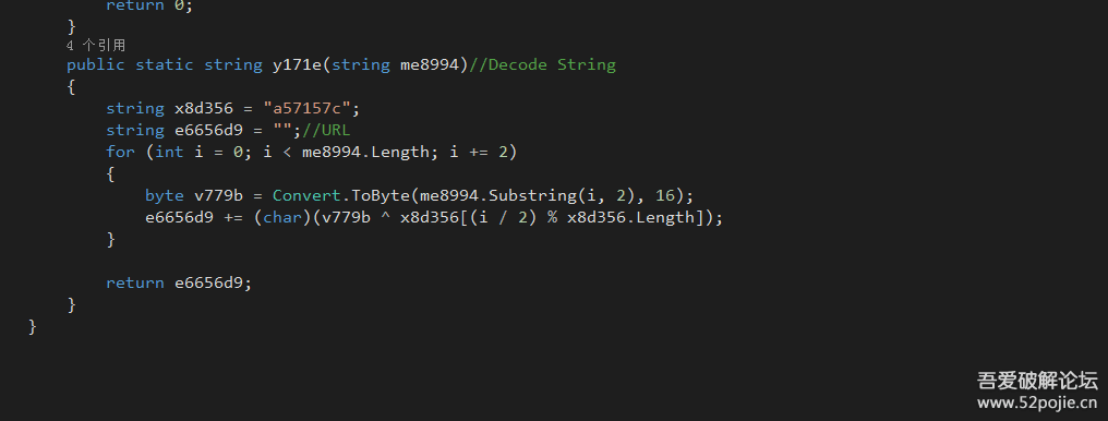 接着先调用y171e函数执行字符串解密功能,这里会传入的字符串是待解密字符串,最后会返回解密的内容,如下是解密函数