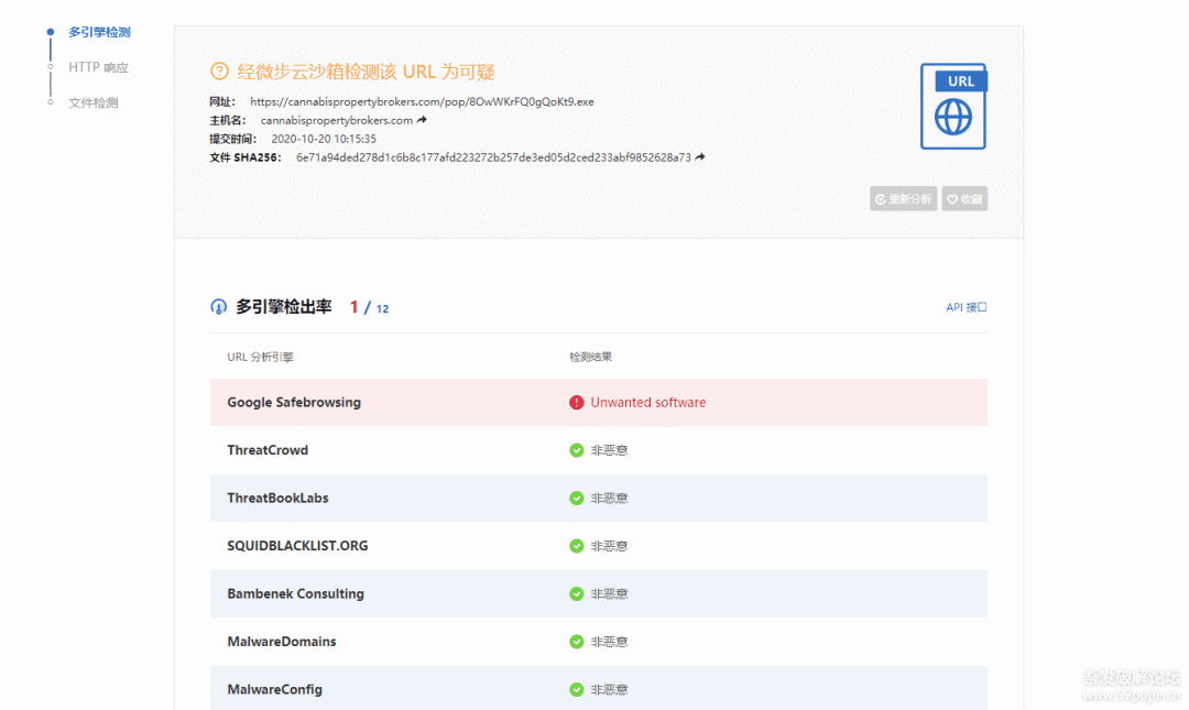 将提取的url到微步上查询,微步被标记为了可疑状态,但是只有Google的检测出来