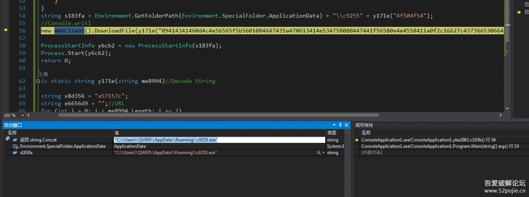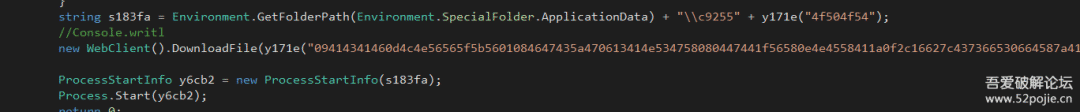 可以确定这个程序首先会对AMSI执行打补丁防止被扫描到。最后准备一个文件路径并调用WebClient函数执行文件下载和执行下载的文件。这里这个C#函数就是一个下载核心的文件并启动运行。