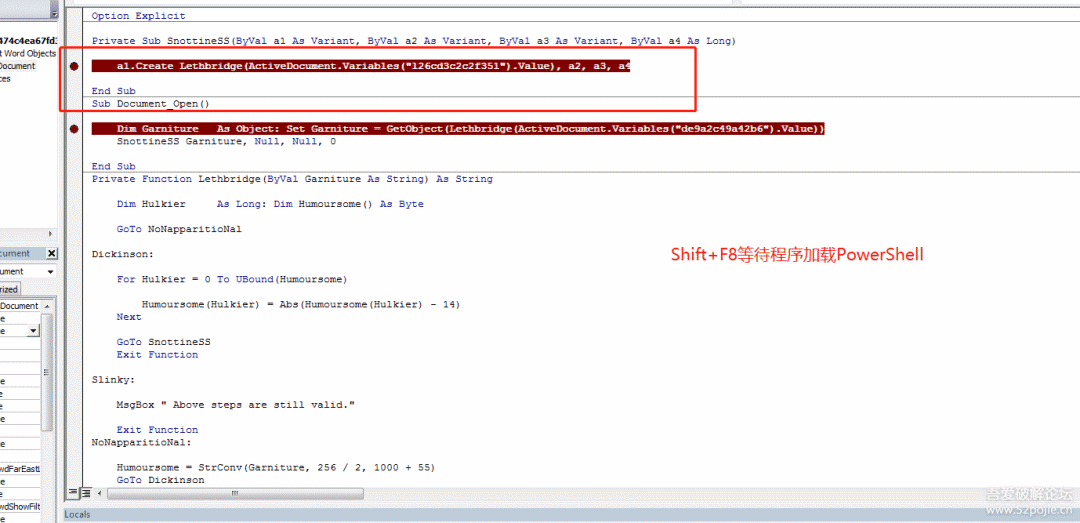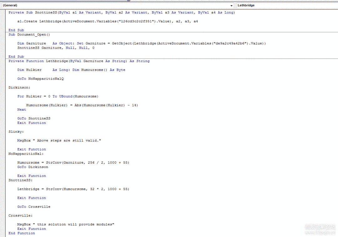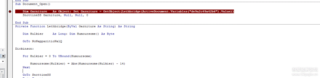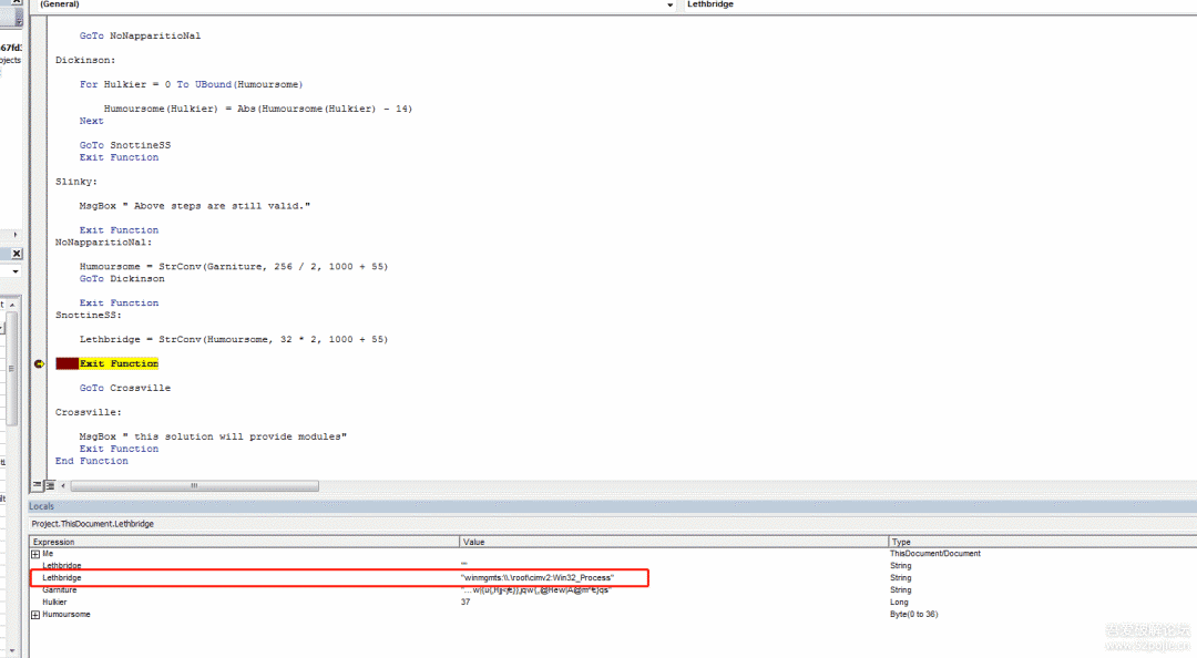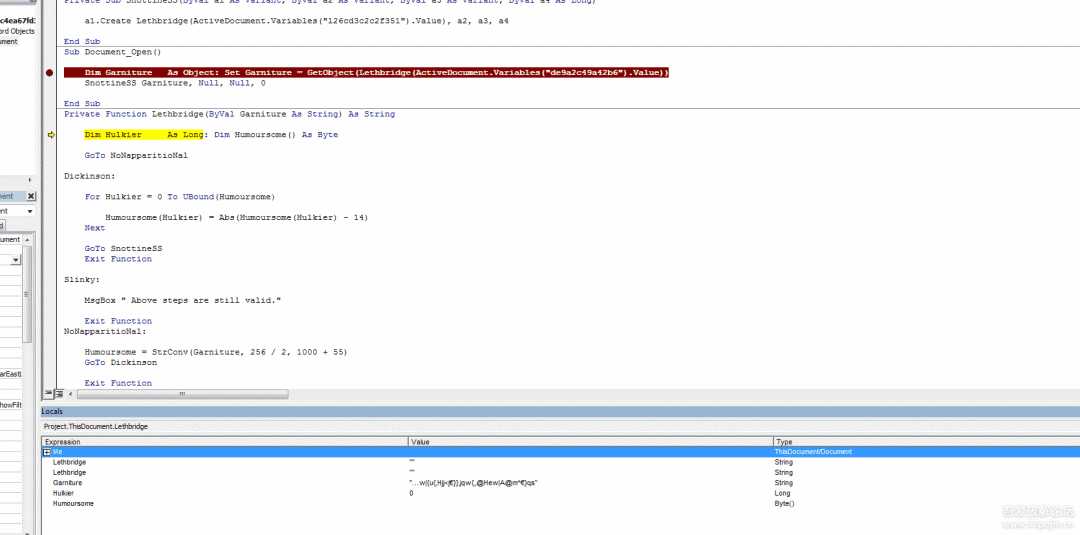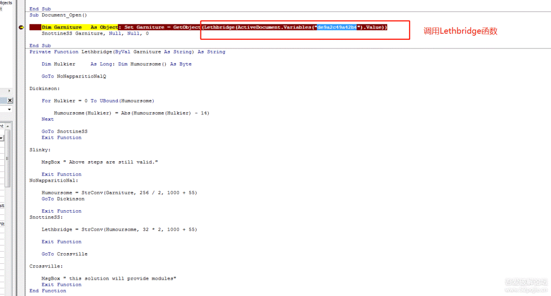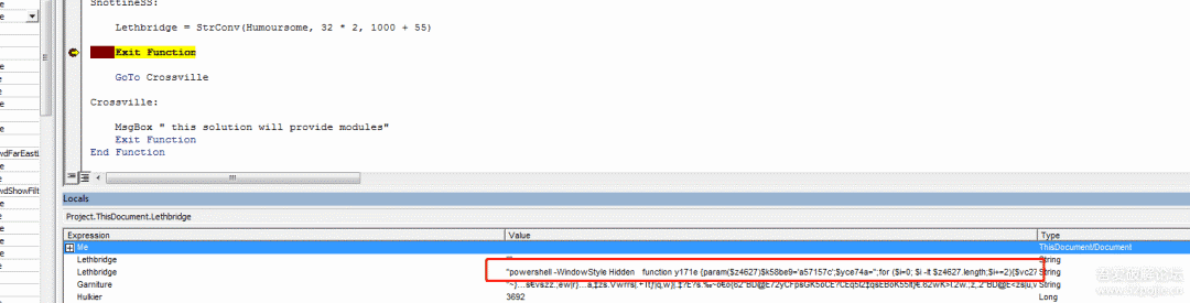 紧接着单步步入(F8)进入到函数Lethbridge(ByVal Garniture As String)内,可以看到该函数有一个参数,在入口的位置传入的值是