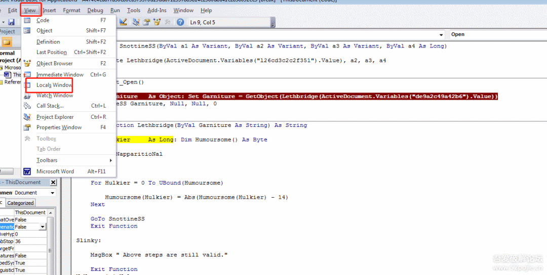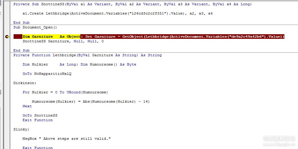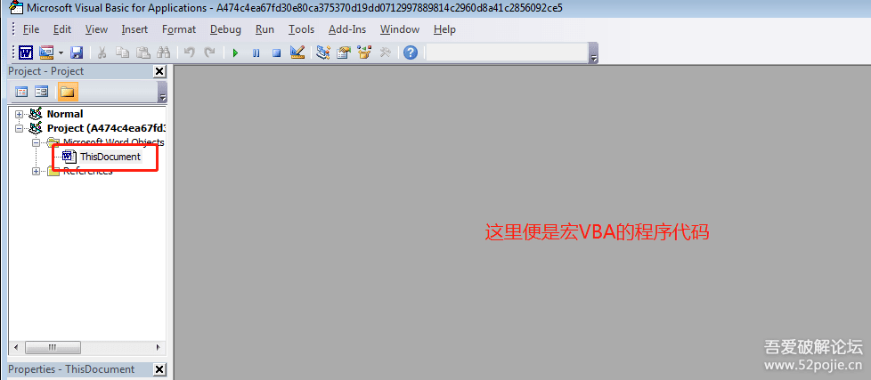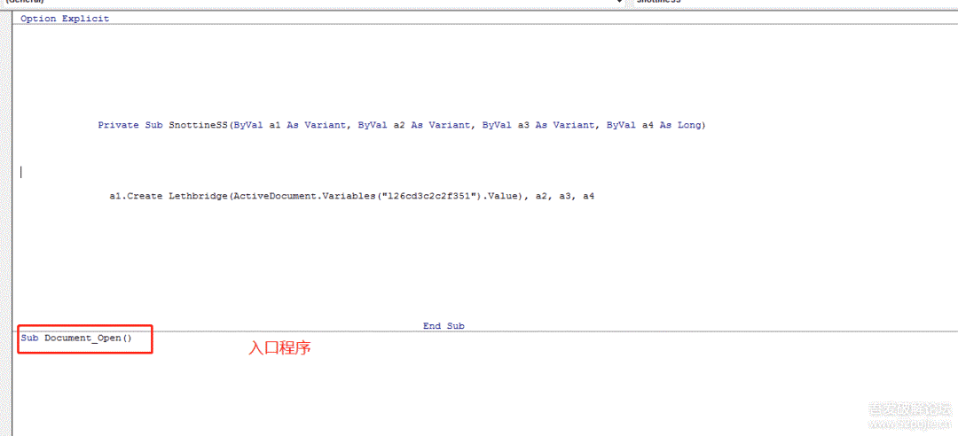 这里很典型的Office类病毒的惯用手法,使用VBA宏来隐藏实际功能,这里进行调试分析VBA宏。
