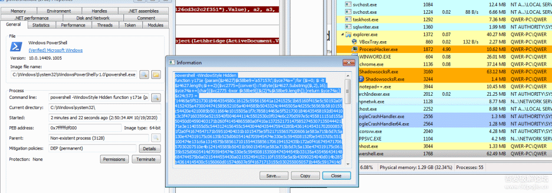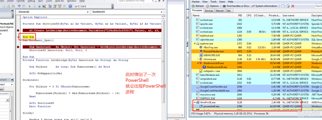 在继续单步调试后,观察到ProcessHacker内的进程列表出现了PowerShell
