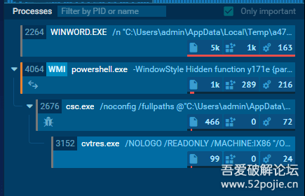 运行时会启动Powershell.exe csc.exe cvtre.exe这三个进程,如下