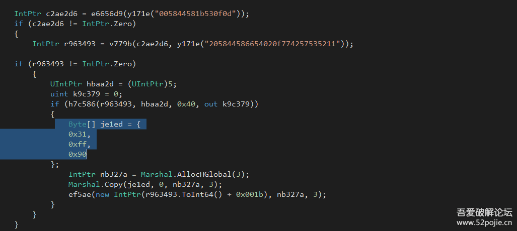 解密过程就是遍历传入的字符串然后进行异或后返回最终结果,程序接着会进行一系列的判断然后分别调用GetProcAddress函数,这个API通常是用来获取指定的模块的导出函数的指针,由此猜到了第二个字符串解密应该是一个api的解密,紧跟着就判断获取的函数是否为空,如果不为空,就调用VirtualProtect函数修改对应的内存属性PAGE_EXECUTE_READWRITE = 0x40,之后调用Marshal函数分配内存并将
