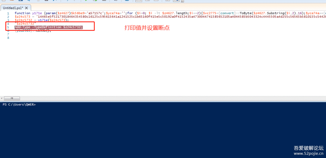 这里调用PowerShell调试器将解密出的内容打印出来并进行分析,贴入代码到PowerShell ISE内,并设置断点在Add-Type的位置,同时在上一行打印$z24c5732的值,如下