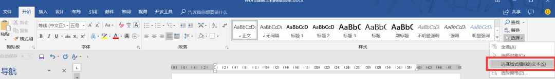 ⑤“开始”选项卡,最右侧“选择”-“选定所有格式类似的文本”