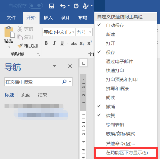 先将上方的快速访问工具栏固定到下方: