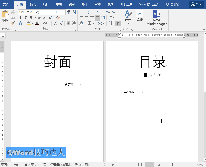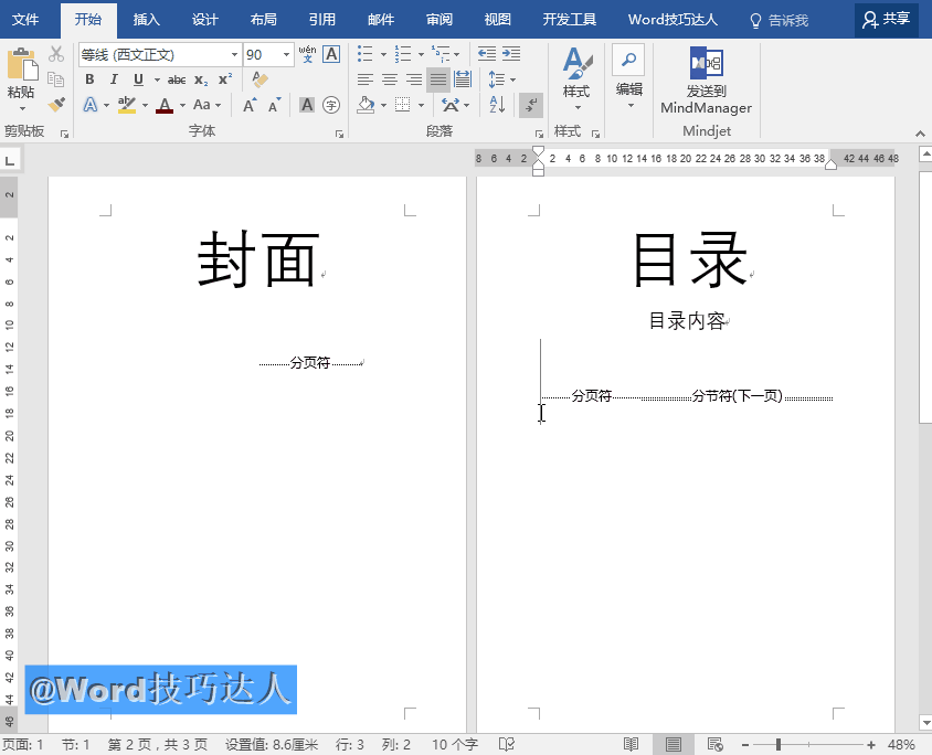 要单独设置正文,则需要将正文与前面的封面和目录部分分割开。在Word中,这一目的需要使用【分节符】来实现。