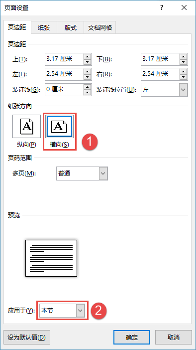 ❸最后,定位到横向表格页,调出【页面设置 】对话框,将页面方向改为“横向”,再看【应用于】那里,默认已经选择了“本节”: