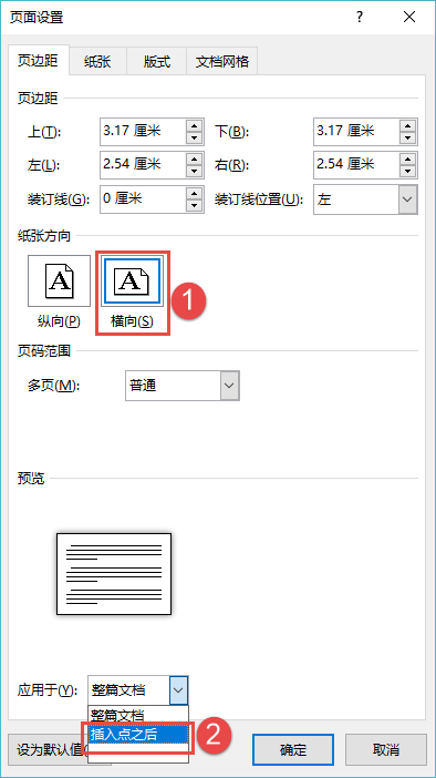 这样设置后,插入点之后的页面就会全部变成横向页面。如果只是希望添加一页横向页面的话,还需要在横向页尾部将“插入点之后”的页面设置回纵向。