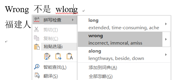 由于中文组词的博大精深,Word 没法很好地判断中文的错别字,但是英文单词的拼写错误,它都会认真地给你标上红线。在错误单词上点击右键,还会给出推荐的正确拼写。