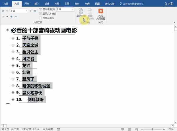 经过试验,King发现了一个批量完成,一步到位的方法:先把每一部电影的内容折叠起来,再选中标题,这样选中的每个标题,其实是包含了正文内容的。折叠的方法,就是只显示到级别2。操作方法如下: