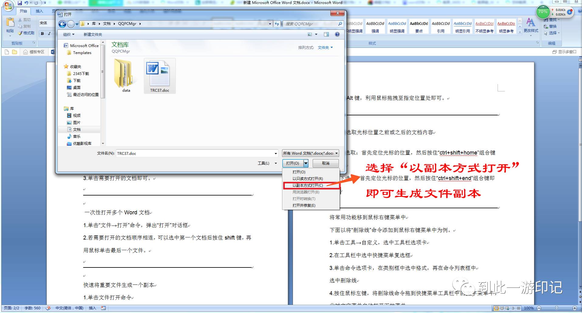 3.单击打开按钮右边的小三角形,在下拉菜单中选中“以副本方式打开”。