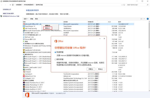 方法2:控制面板-程序和功能-修复