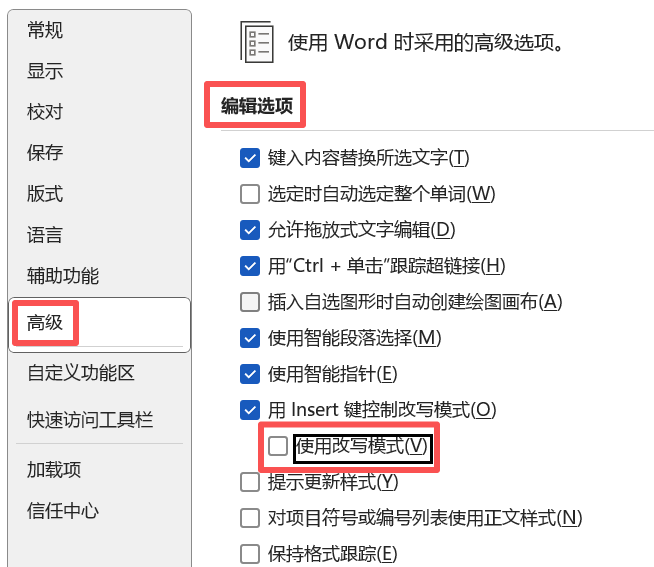 检查:是否在“Word选项”中禁用了改写模式