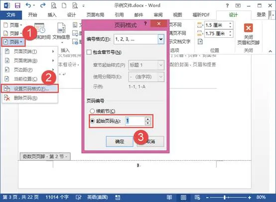 但此时的并不是从1开始,需要设置页码格式。点击【页码】-【设置页码格式】,在弹出的对话框中设置【起始页码】为“1”,点击【确定】。