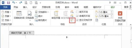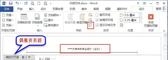 在正文首页的前一页末尾插入【分节符】,鼠标双击正文首页页眉,进入编辑状态。在【页眉和页脚工具】的【设计】选项卡下勾选“奇偶页不同”。同时正文页需要与封面和目录页区分,所以需要断开“链接到前一条页眉”。