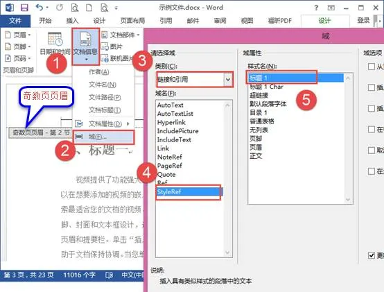鼠标还是定位到页眉,点击左侧的插入【文档部件】-【域】,在弹出的对话框中选择【链接和引用】下的【StyleRef】域,在右侧的“样式名”中找到对应的样式名称,点击【确定】。