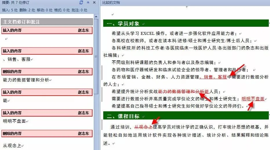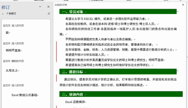 点击确定按钮后,两个文档的差异很清楚的被标注出来,包括添加、修改、删除的内容。