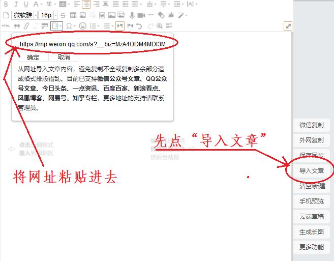 4、点击135微信编辑器右侧菜单“导入文章”,将网址粘贴进去,点“确定”。