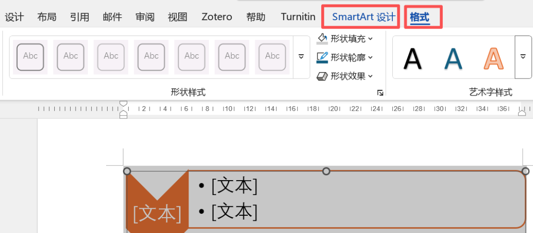 插入后,选中图形会自动出现 “SmartArt工具-设计” 和 “格式” 选项卡。