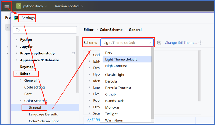 Settings→editor→color scheme→general→选择“light”