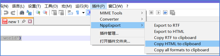 插件→NppExport→copy HTML to clipboard