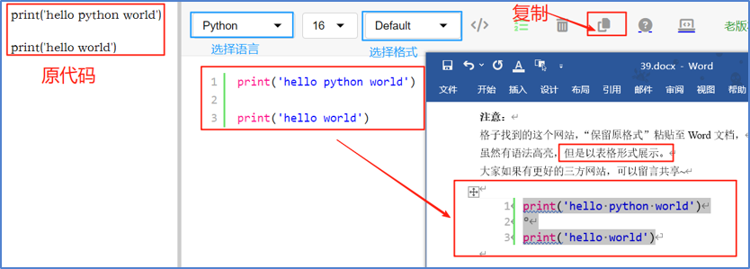 格子找到的这个网站,“保留原格式”粘贴至Word文档,虽然有语法高亮,但是以表格形式展示(大家如果有更好的三方网站,可以留言共享~)