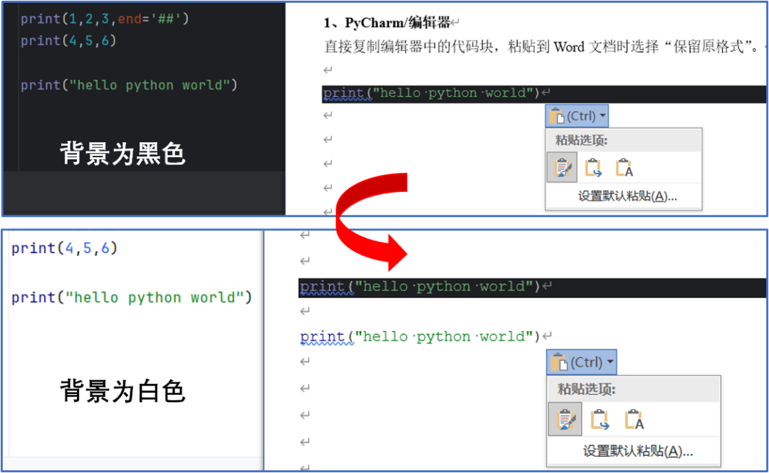 注意:从图中可以看出,若原编辑器背景是黑色,则粘贴至文档中也保留的黑色底纹。