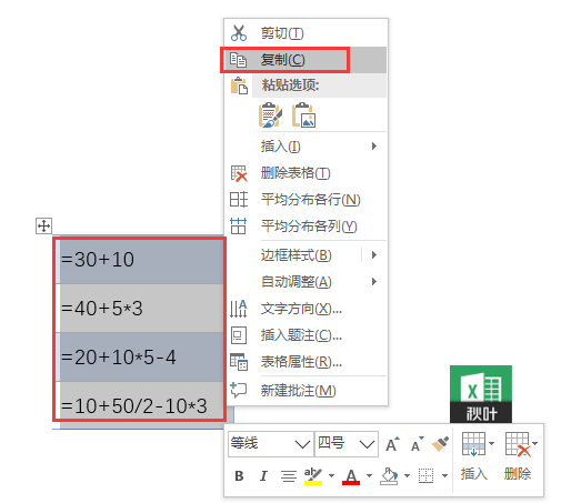 ❶ 将表达式变成与单元格中的公式一样的效果,然后通过 Word 中转下,就能将文本表达式变成计算结果!