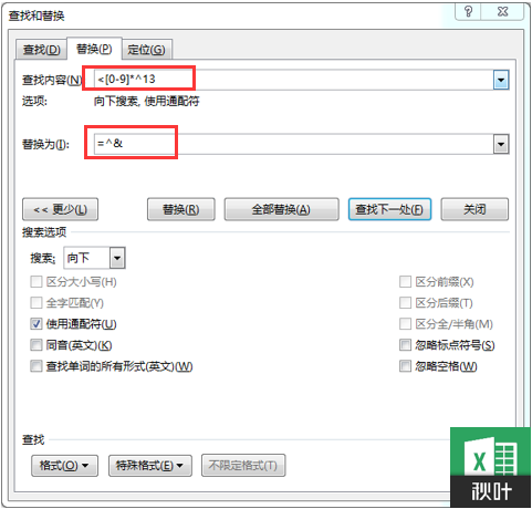 在【替换】中输入:「 =^& 」