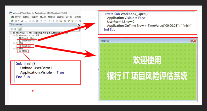2)调用窗体是一个工作簿事件,我们需要达到的效果是,欢迎界面覆盖了整个Excel界面,且该欢迎界面显示3秒后自动消失;