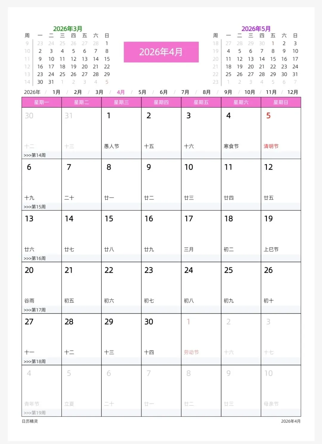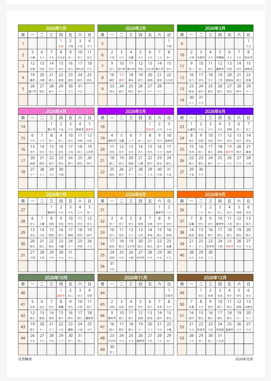 >2026年日历全年表,word和excel,电子版可打印