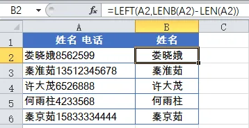 如下图,要从A列姓名电话中提取出姓名,除了使用高版本的自动填充功能,还可以使用公式完成:
