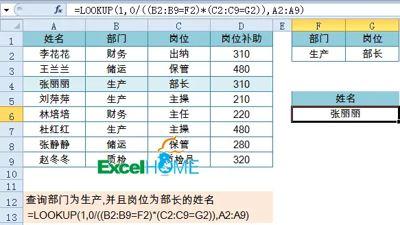 =LOOKUP(1,0/((条件区域1=条件1)*(条件区域2=条件2)),查询区域)