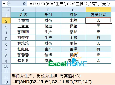 如下图所示,如果部门为生产、岗位为主操 有高温补助。在D列使用公式: