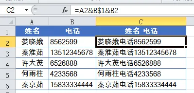 要连接合并多个单元格中的内容,可以使用&符号完成。如下图,要合并A列的姓名和B列的电话号码,可以使用公式: