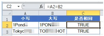 如果在A1和A2单元格中分别输入大小写的单词,使用以下公式判断时,Excel会默认二者是相同的:
