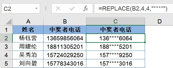 本例中,表示从B4单元格的第四个字符开始,替换四个字符,替换的新字符为“****”。
