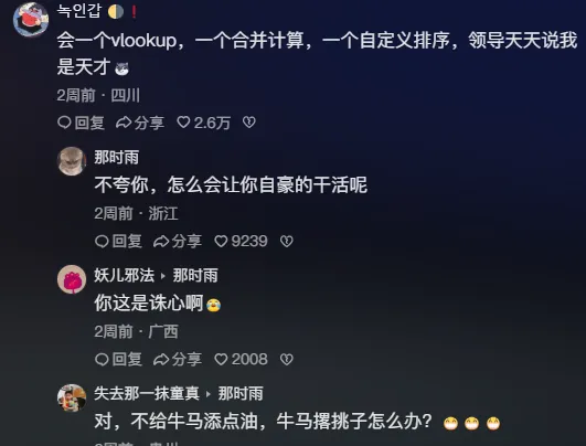 还有网友说:无论是老板还是打工牛马,其实对Excel没太大认知,出来找工作不要太老实。我刚出来工作都不敢说精通,但其实在里面上班的人他们其实就会做个表格+打印出来,你多会一些函数对他们来说都是超标的存在!
