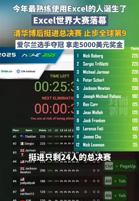 这两天微软excel世界锦标赛大总决赛落下了帷幕,清华大学的博士后张云翼杀入24人的决赛,但是止步在第九名,而爱尔兰的计算机教授斩获了第一名,拿到了5000美金的冠军奖金。