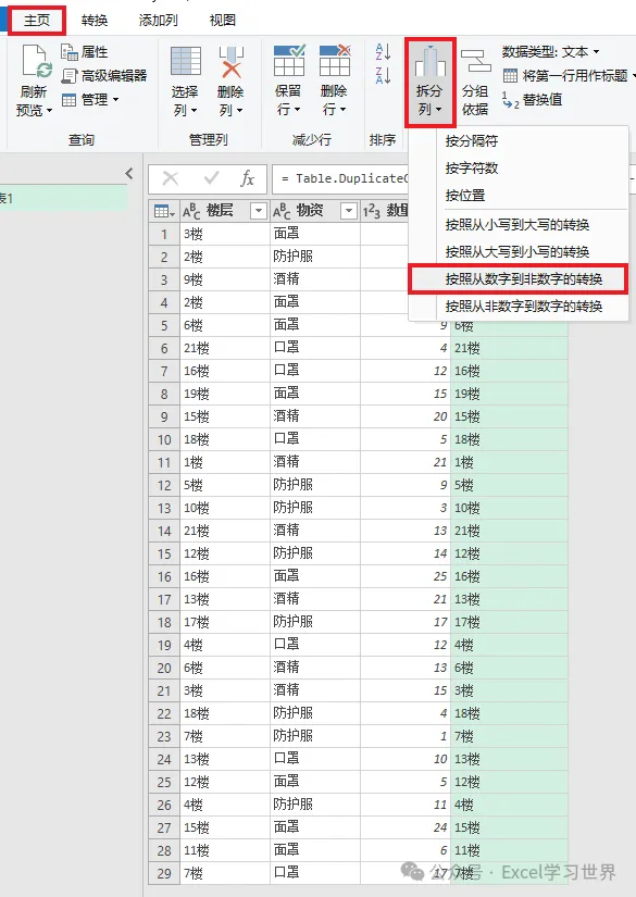 4. 选中复制出来的列 --> 选择工具栏的“主页”-->“拆分列”-->“按照从数字到非数字的转换”