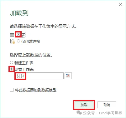 9. 在弹出的对话框中选择“表”--> 选择“现有工作表”及所需上传至的位置 --> 点击“加载”