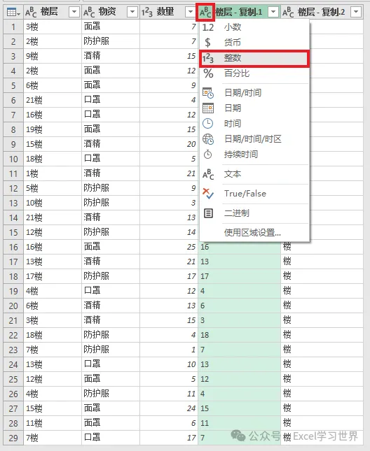 5. 点击“楼层 - 复制.1”左边的格式符号 --> 在弹出的菜单中选择“整数”